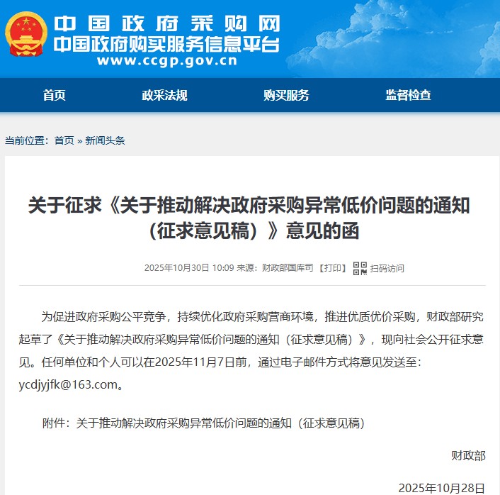 財(cái)政部就《關(guān)于推動(dòng)解決政府采購(gòu)異常低價(jià)問(wèn)題的通知(征求意見(jiàn)稿)》向社會(huì)公開征求意見(jiàn)